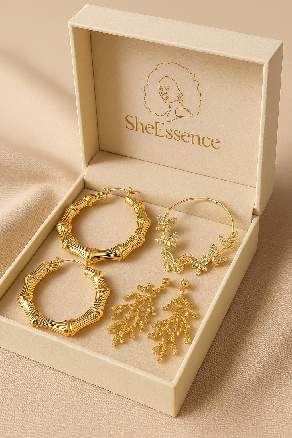 Unbox the beauty of She Essence with our Triple Treat Deal, three pairs of our most loved earrings.